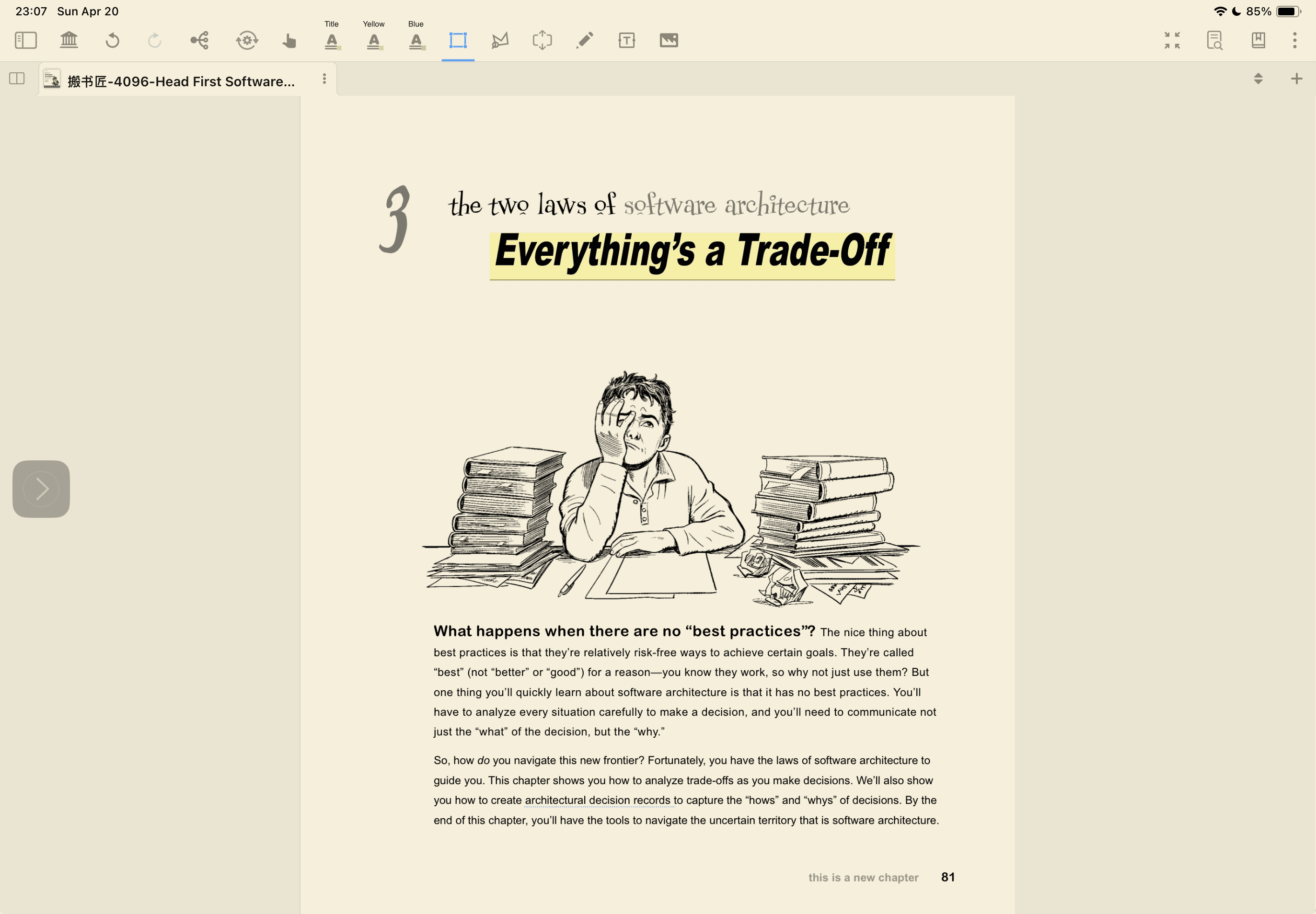 What happens when there are no "best practices"? The nice thing about best practices is that they're relatively risk-free ways to achieve certain goals. They're called "best" (not "better" or "good") for a reason—you know they work, so why not just use them? But one thing you'll quickly learn about software architecture is that it has no best practices. You'll have to analyze every situation carefully to make a decision, and you'll need to communicate not just the "what" of the decision, but the "why."