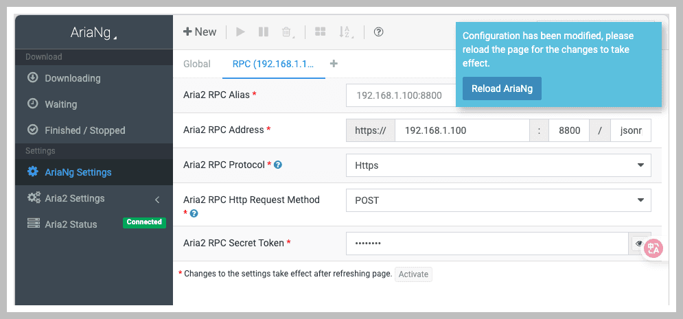RPC_SECRET:用于前端连接后端的密码,确保安全性。在配置 Client 时,需要使用对应 Server 的端口和 RPC_SECRET:1. 打开 AriaNg Setting,进入 RPC 设置页面。2. 配置以下内容: